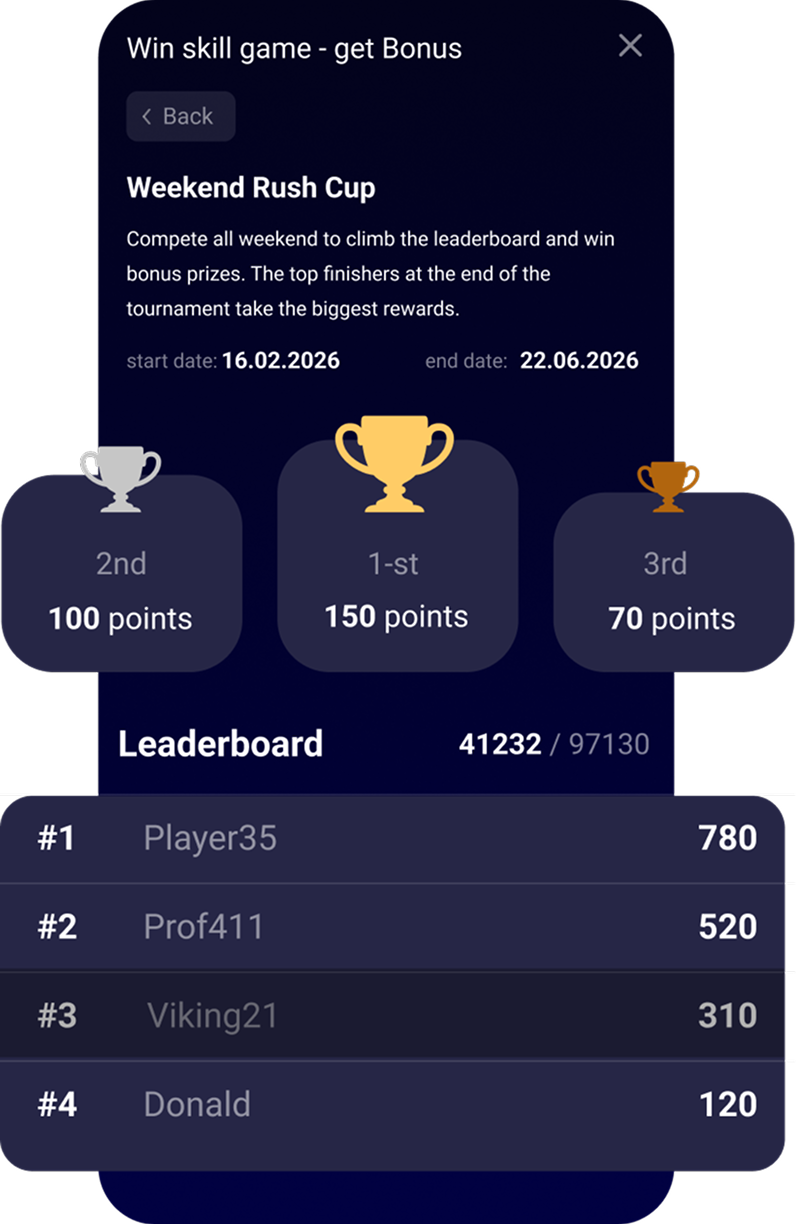 A lightweight mini‑lobby that won’t overload your website. It gives you a single entry point where players join skill-based tournaments, track leaderboards, earn points, and redeem rewards — creating a clear reason to return.